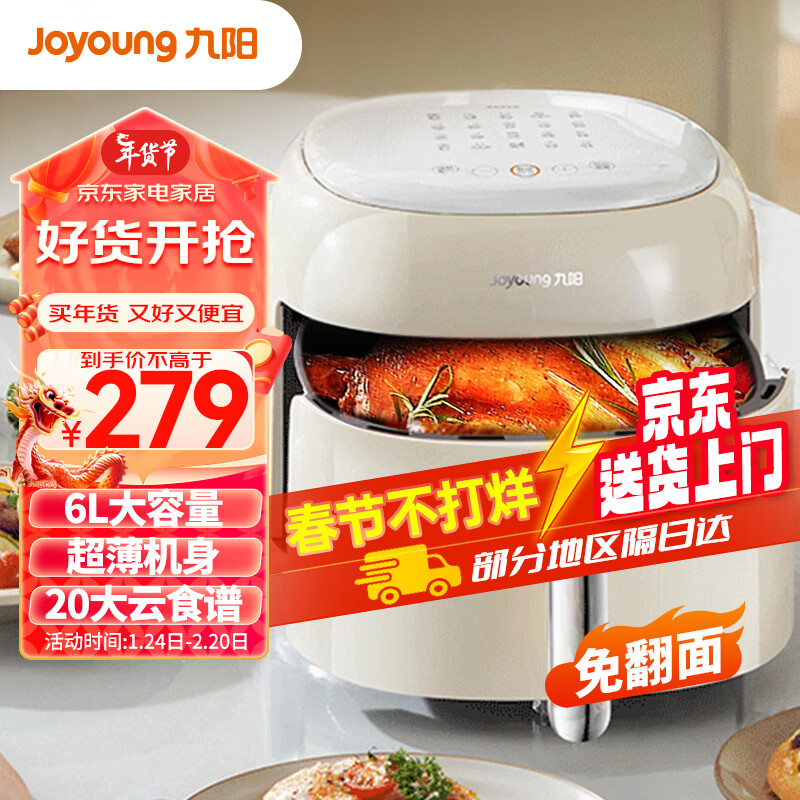 九阳(Joyoung)空气炸锅家用智能 6L大容量多功能 超薄 高端触控屏 无油煎炸 KL60-V6价格:279.00元!