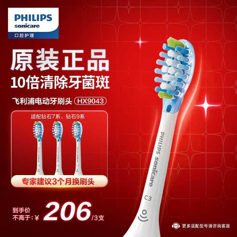 飞利浦(PHILIPS)电动牙刷刷头 智臻洁净型刷头C3 HX9043/67 3支装 白色 适配钻石7系、9系价格:206.00元!