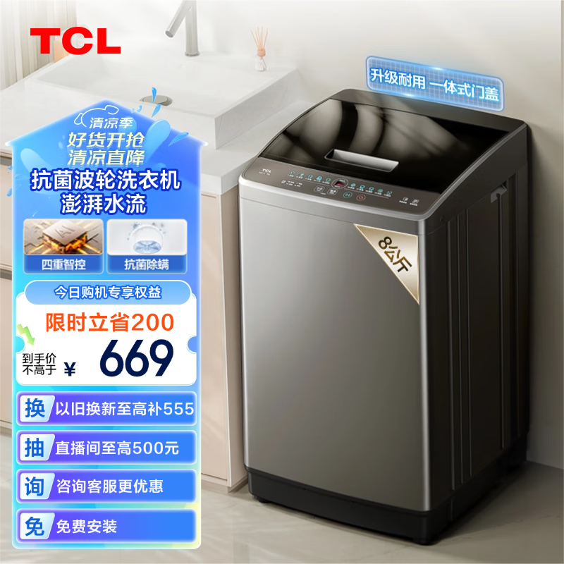 TCL 8公斤抗菌家用全自动波轮洗衣机 除螨洗 宿舍租房神器 以旧换新 B80V2价格:669.00元!