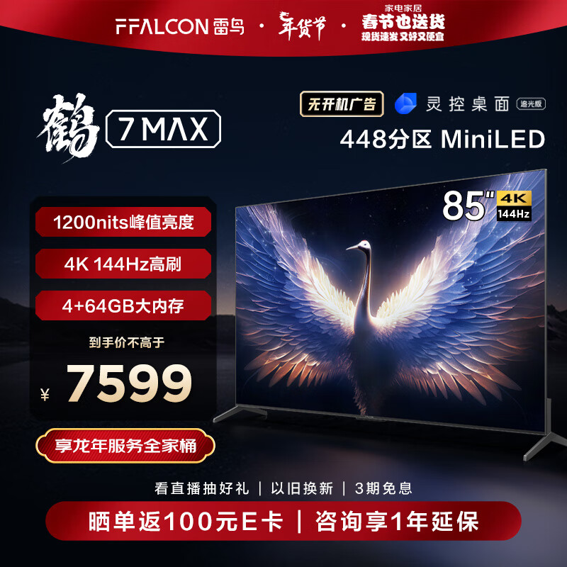 FFALCON雷鸟 鹤7MAX 85英寸MiniLED电视 144Hz高刷 4K超高清 4+64GB 智慧屏智能液晶平板电视机85R675C价格:7599.00元!