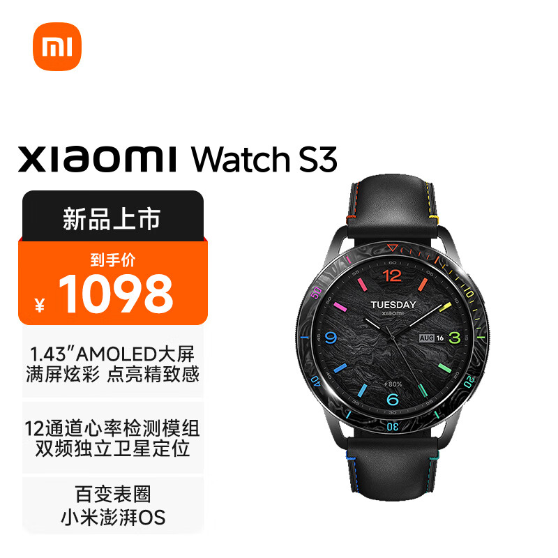 小米(MI)Xiaomi Watch S3 黑色+Xiaomi Watch 表圈表带 黑彩虹价格:1098.00元!