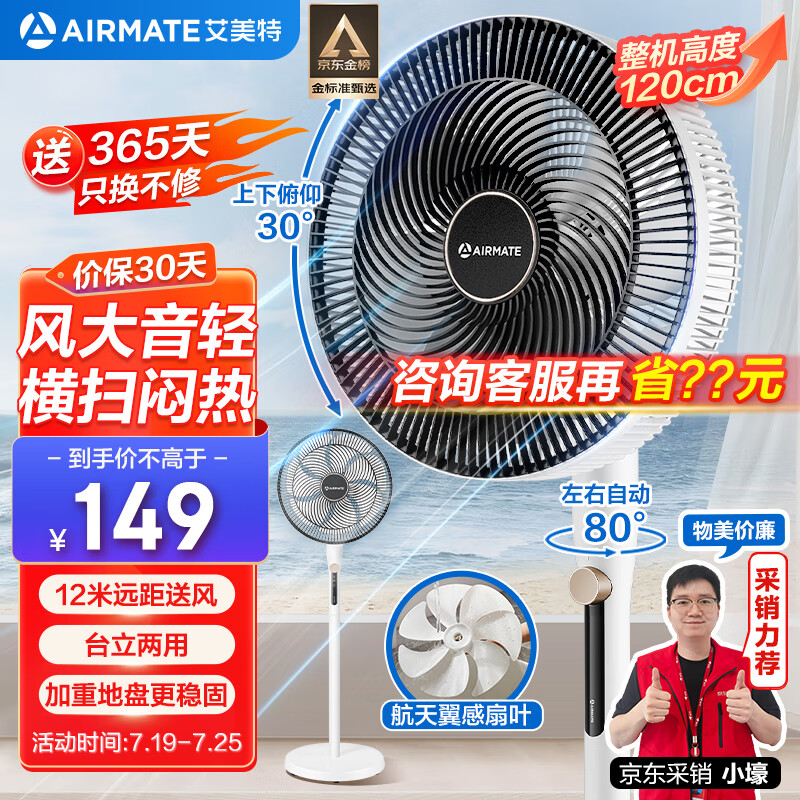 艾美特(AIRMATE)七叶大风量落地扇家用轻音节能电风扇台立式左右摇头空气循环风扇底盘加固 FS35-X76价格:159.00元!