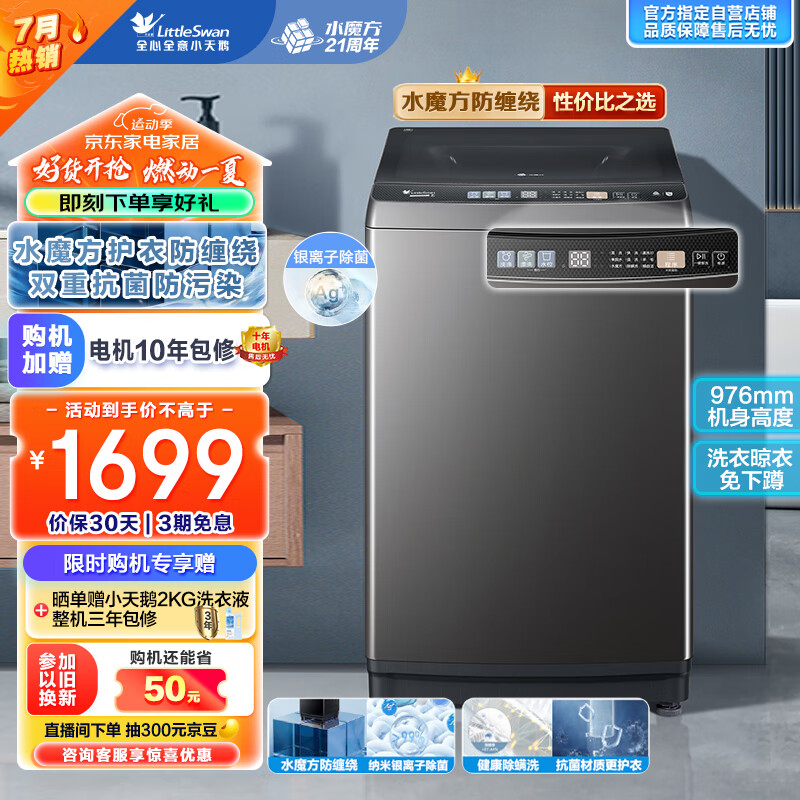 小天鹅(LittleSwan)波轮洗衣机全自动 水魔方系列 【TB100V81T】 防缠绕 纳米银离子除菌 深层除螨 无孔内桶 10公斤价格:1699.00元!