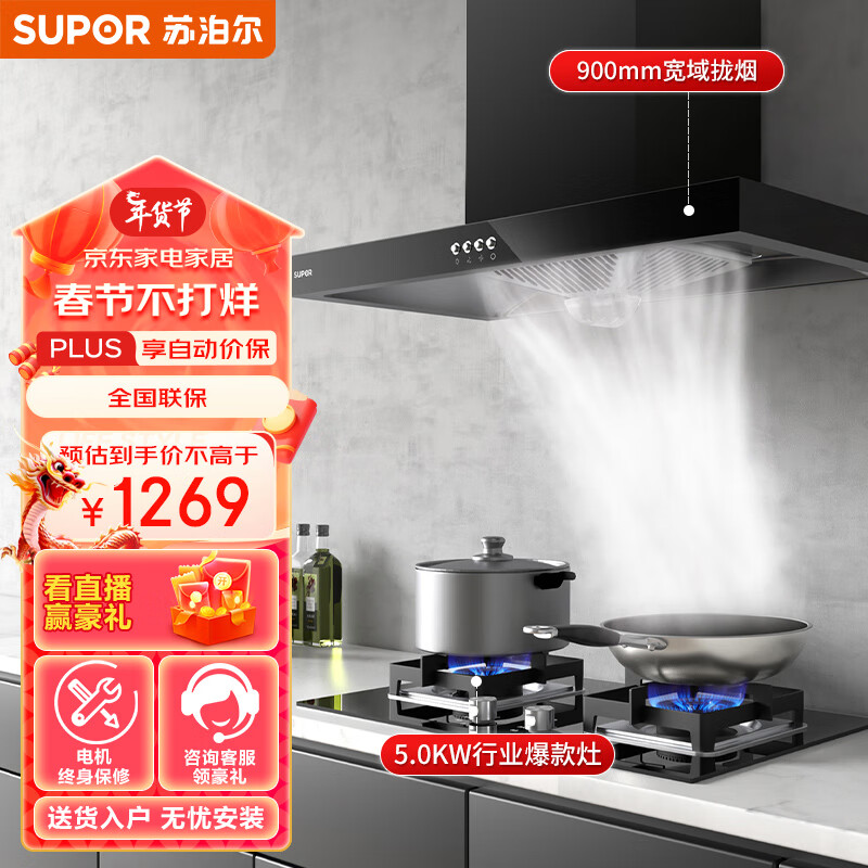 苏泊尔(SUPOR)排油烟机 宽域拢烟大吸力油烟机 家用易清洁欧式顶吸抽油烟机 吸油烟机燃气灶套装DT10+Q5液化气价格:1199.00元!