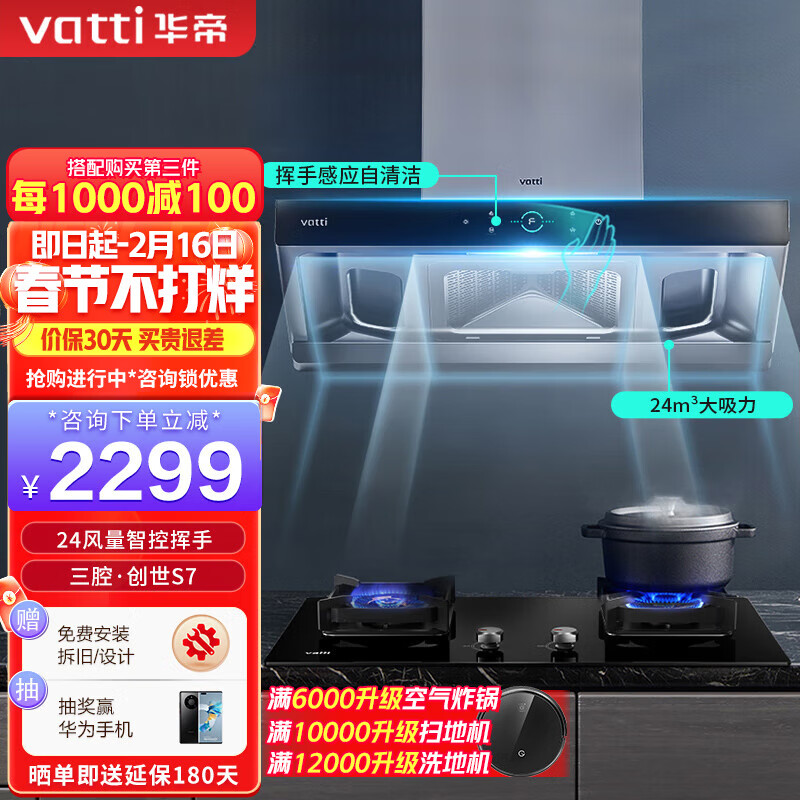 华帝i11207三腔变频油烟机创世S7 欧式抽油烟机家用自动清洗24立方米大风量爆吸 i11207 单烟机价格:2299.00元!