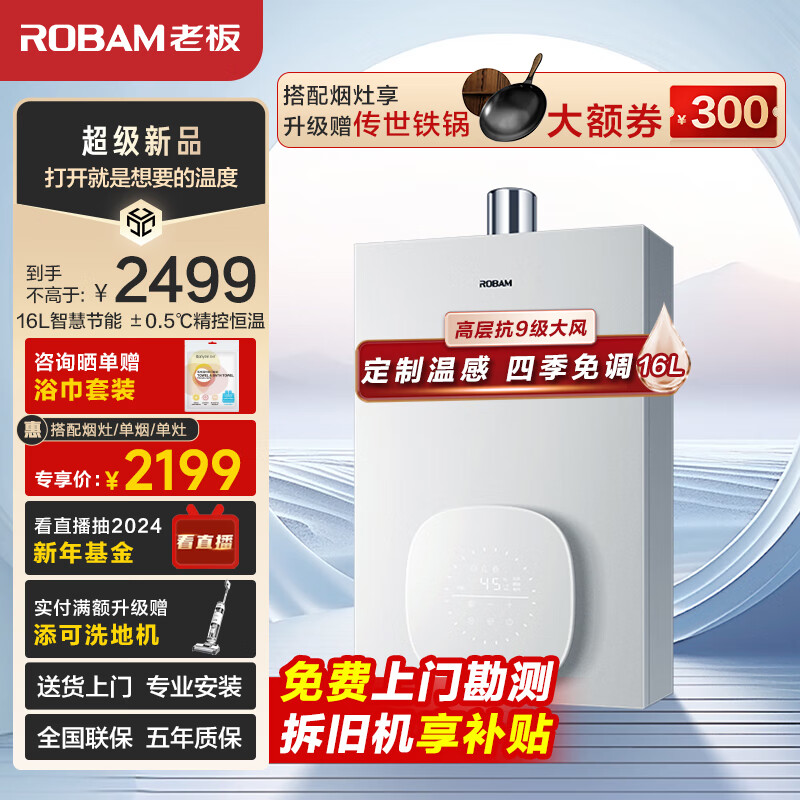 老板(Robam)小云朵16升燃气热水器天然气匀氧稳燃小尺寸智能恒温降噪高层抗风防冻家用强排式JSQ31-HT322A-16价格:2499.00元!