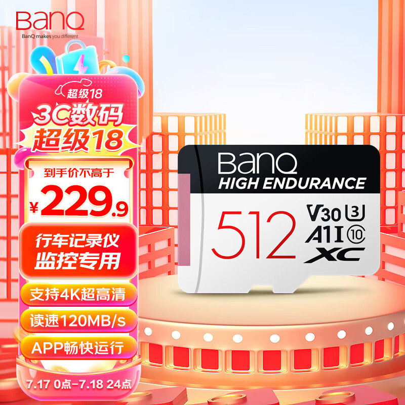 banq 512GB TF(MicroSD)存储卡 A1 U3 V30 4K 行车记录仪&安防监控专用内存卡 高度耐用价格:229.90元!