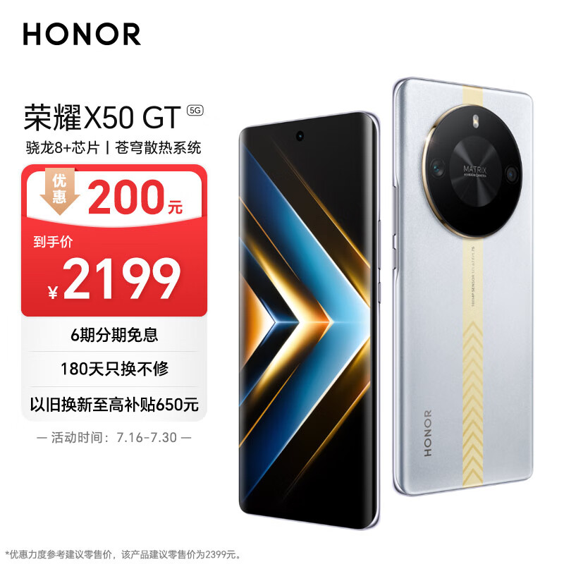 荣耀X50 GT 骁龙8+芯片 苍穹散热系统 灵龙触控引擎 5800mAh电池 5G 游戏手机 16+256 银翼战神价格:2399.00元!
