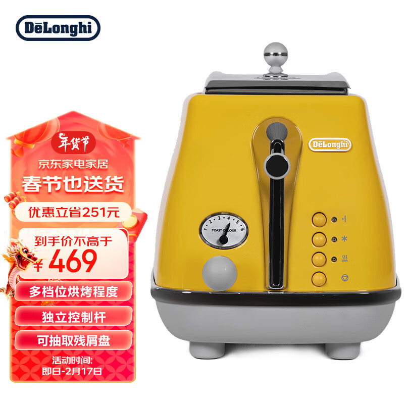 德龙(Delonghi)面包机 复古系列多士炉 不锈钢内胆烤吐司机 家用烤面包机 CTOC2003.Y 波西塔诺黄价格:469.00元!