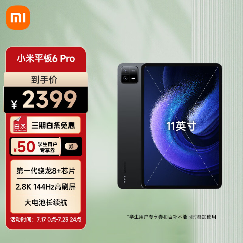 小米平板6Pro xiaomiPad 11英寸 骁龙8+强芯 144Hz高刷 2.8K超清 8+256GB 移动办公娱乐平板电脑黑色价格:2399.00元!