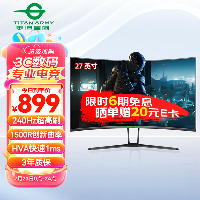 泰坦军团27英寸 240Hz 创新曲率1500R 广色域 电竞背光 工学支架 HVA快速1ms 游戏曲面屏电脑显示器 N27SH2价格:1099.00元!