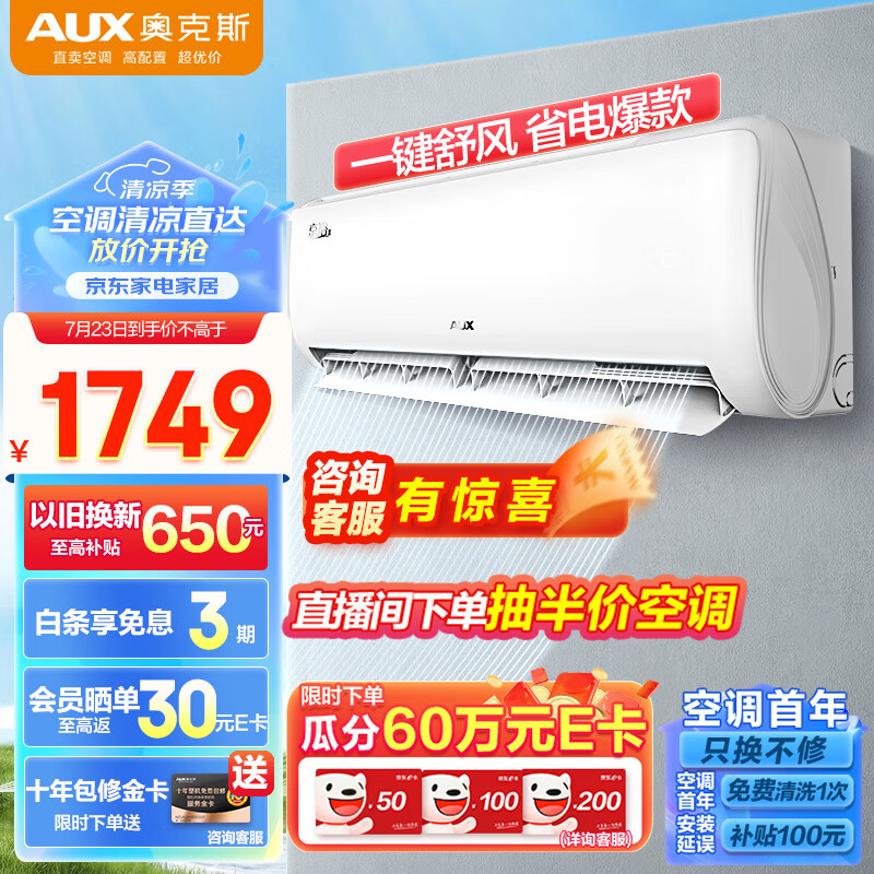 奥克斯(AUX)大1匹 新1级能效 易拆银离子滤网 变频冷暖 京裕Ⅱ空调挂机(KFR-26GW/BpR3AQE1(B1)) 独立除湿价格:1749.00元!