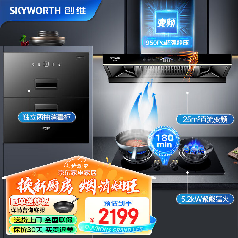 创维(Skyworth)烟灶消厨房三件套 25变频欧式顶吸油烟机5.2kW鸳鸯燃气灶 家用嵌入式消毒柜Y016+Z211B+X19A天然气价格:2199.00元!