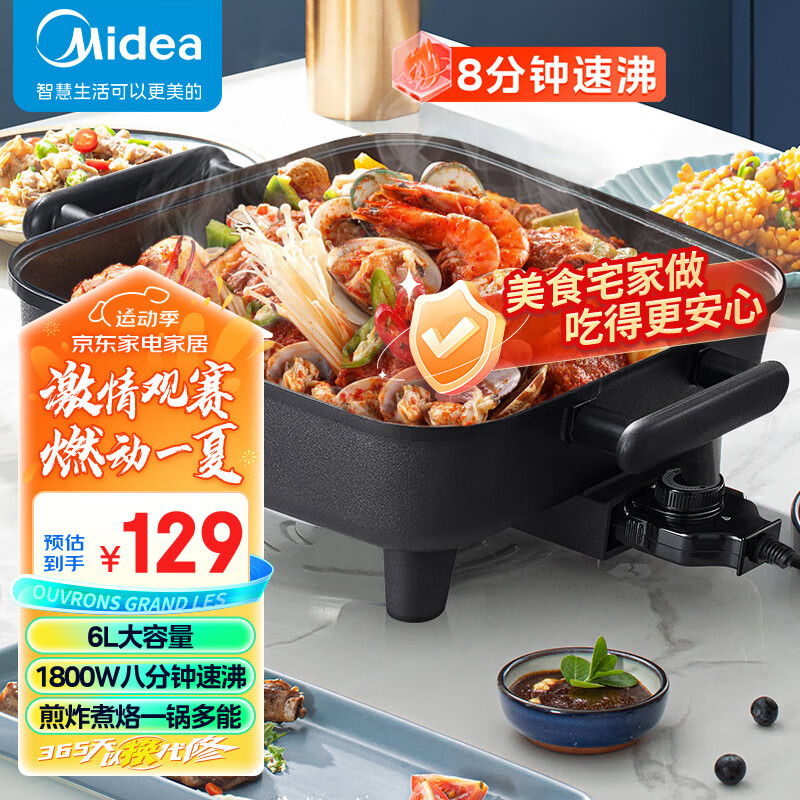 美的(Midea)电火锅 电炒锅家用多功能电锅煎烤涮一体电热电煮锅6L 火锅锅不粘烤鱼锅DY3030Easy101价格:109.00元!