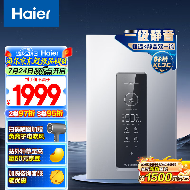 海尔(Haier)16升【好梦KL3C】燃气热水器天然气 水伺服恒温 五段微火一级静音JSQ31-16KL3CFPXCU1【以旧换新】价格:2199.00元!