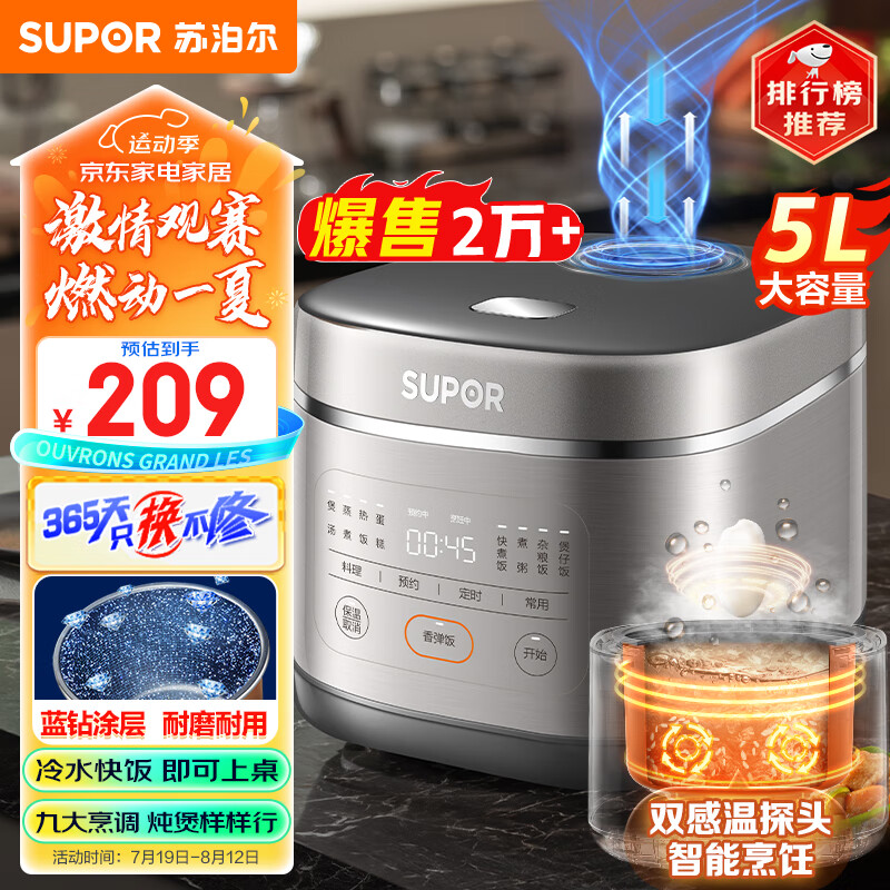 苏泊尔(SUPOR)电饭煲 电饭锅 5L大容量 蓝钻圆厚釜 家用2-8人 多功能煮饭锅 智能预约 快煮饭 香弹饭 SF50FC0054价格:209.00元!