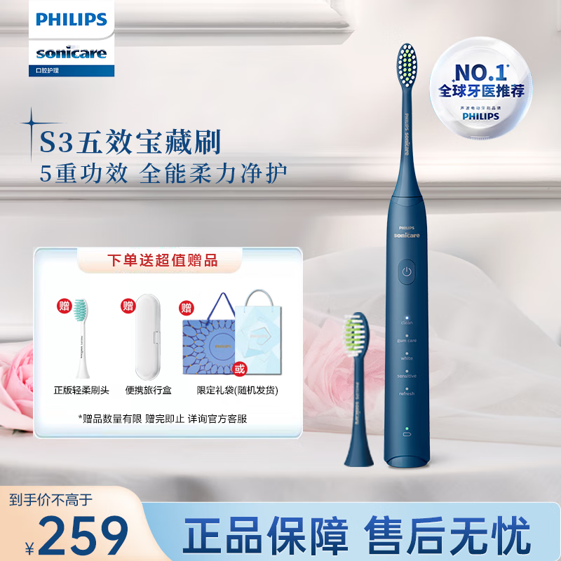 飞利浦(PHILIPS)电动牙刷S3成人 七夕礼物送男/女礼物情侣款 软毛柔和亮白刷头5效宝藏刷深藏BLUE HX2471/01价格:309.00元!