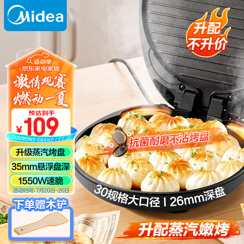 美的(Midea)电饼铛家用煎烤机烙饼锅三明治早餐机蒸汽煎烤盘 大火力烤肉薄饼机双面加热加深电饼档 JKC3051价格:109.00元!