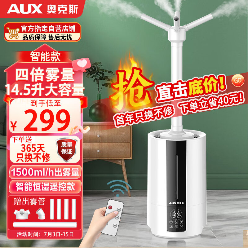 奥克斯(AUX)空气加湿器大容量落地式上加水工业客厅办公室14.5L商用型超市保鲜大雾量喷雾机价格:339.00元!