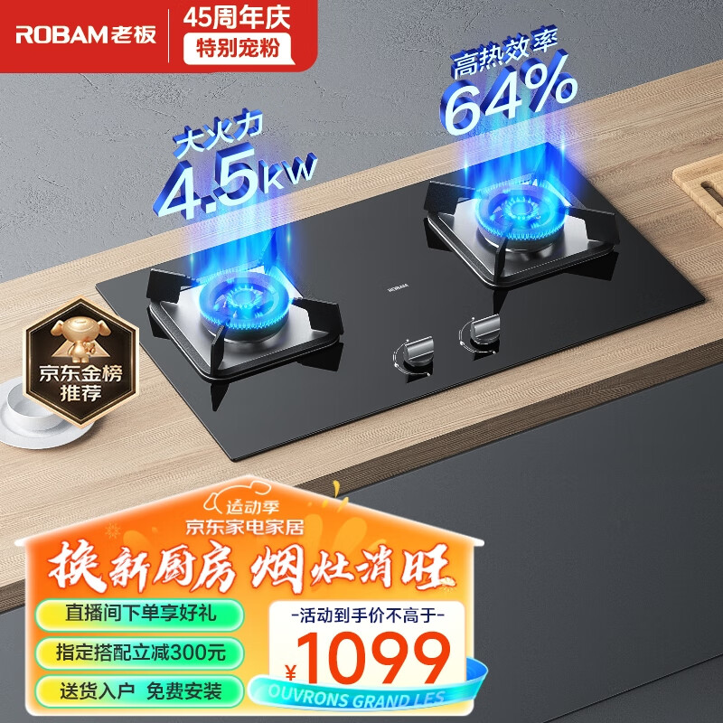 老板(Robam)家用燃气灶 4.5kW天然气灶双灶具灶台 一级能效 钢化玻璃煤气灶台嵌两用小尺寸猛火灶JZT-32B7D价格:1099.00元!