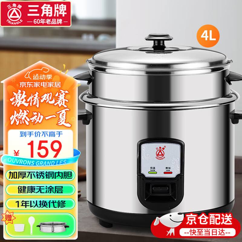 三角牌(Triangle)电饭煲老式电饭锅 家用煮饭锅全不锈钢内胆带蒸笼 4升(适合3-5人)价格:159.00元!