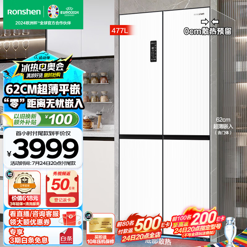 容声(Ronshen)蓝光养鲜零嵌477升十字对开四开多门超薄嵌入式电冰箱家用一级大容量底部散热BCD-477WD3FPLA白色价格:4399.00元!