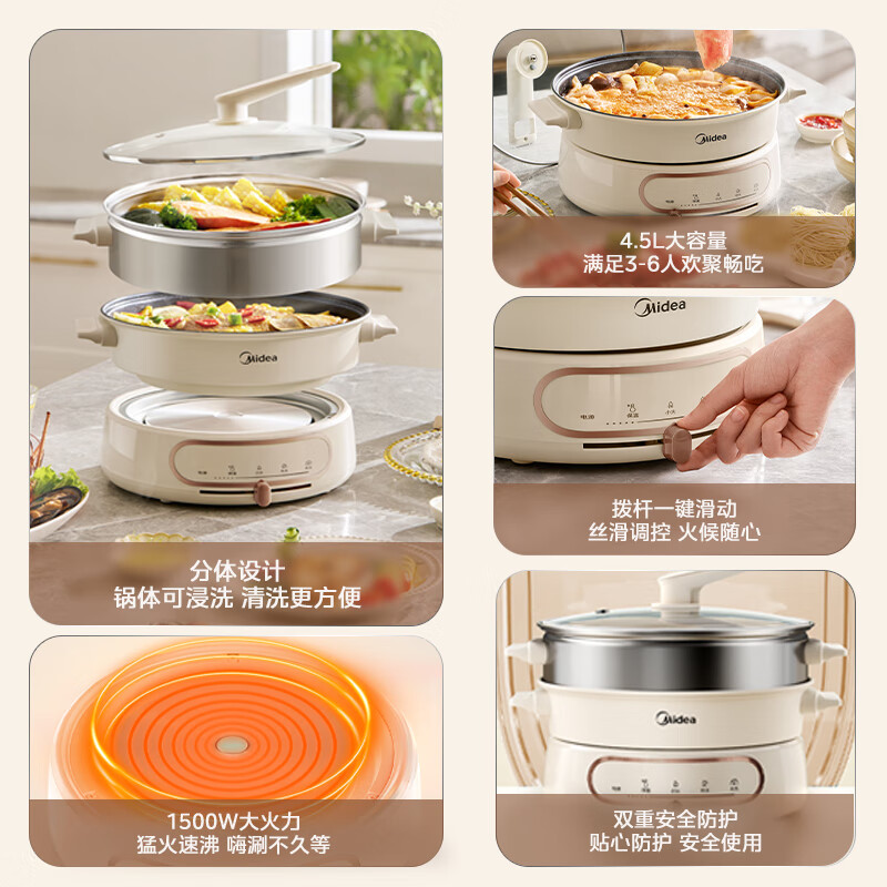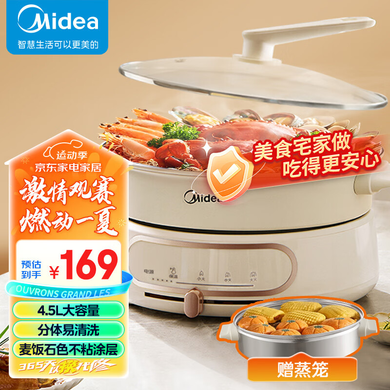 美的(Midea)电火锅电蒸锅家用电煮锅电炒锅分体式多功能烤肉锅4.5L小型宿舍煎炒蒸煮一体HGE28J52价格:169.00元!