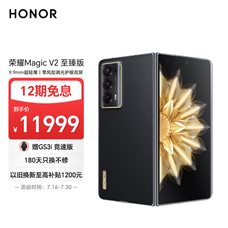荣耀Magic V2 至臻版 折叠屏 9.9mm超轻薄 零风险调光护眼双屏 5000mAh青海湖电池 5G AI 16+1T 雅黑色价格:11999.00元!
