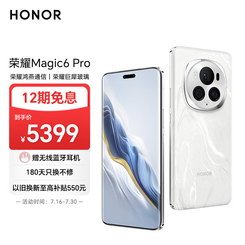荣耀Magic6 Pro 荣耀鸿燕通信 单反级荣耀鹰眼相机 第三代骁龙8芯片 12GB+256GB 祁连雪 5G AI手机价格:5399.00元!