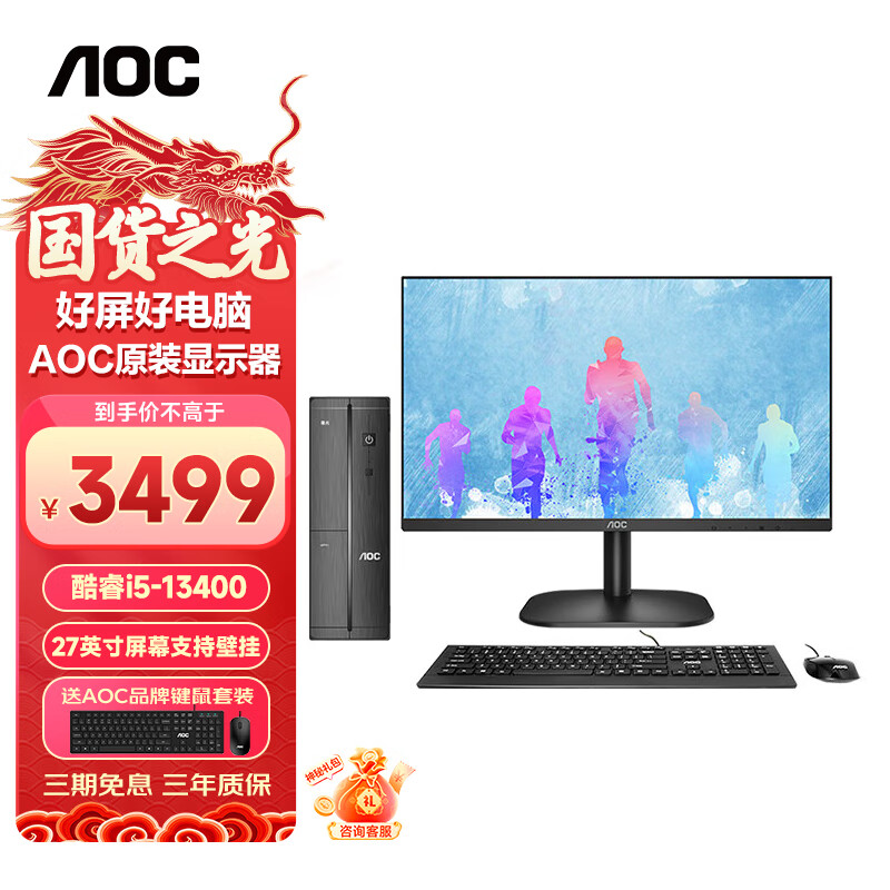 AOC显示器电脑套装电脑台式机整机主机(13代i5-13400 16G 512G 商务键鼠 三年上门)27英寸价格:3499.00元!