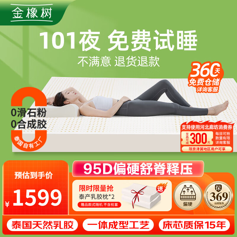 金橡树泰国进口天然乳胶原液加厚双人床垫1.8x2米 92%乳胶含内外套价格:1599.00元!