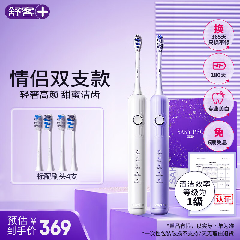 舒客情侣电动牙刷智能1级清洁成人/学生送男友/女友软毛护龈180天续航G5羽白+雾紫 父亲节礼物价格:369.00元!