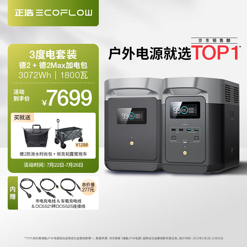 ECOFLOW正浩 【3度电套装】快充移动户外电源220V 1800W大容量大功率 车载自驾露营野营便携应急储能备用价格:7699.00元!