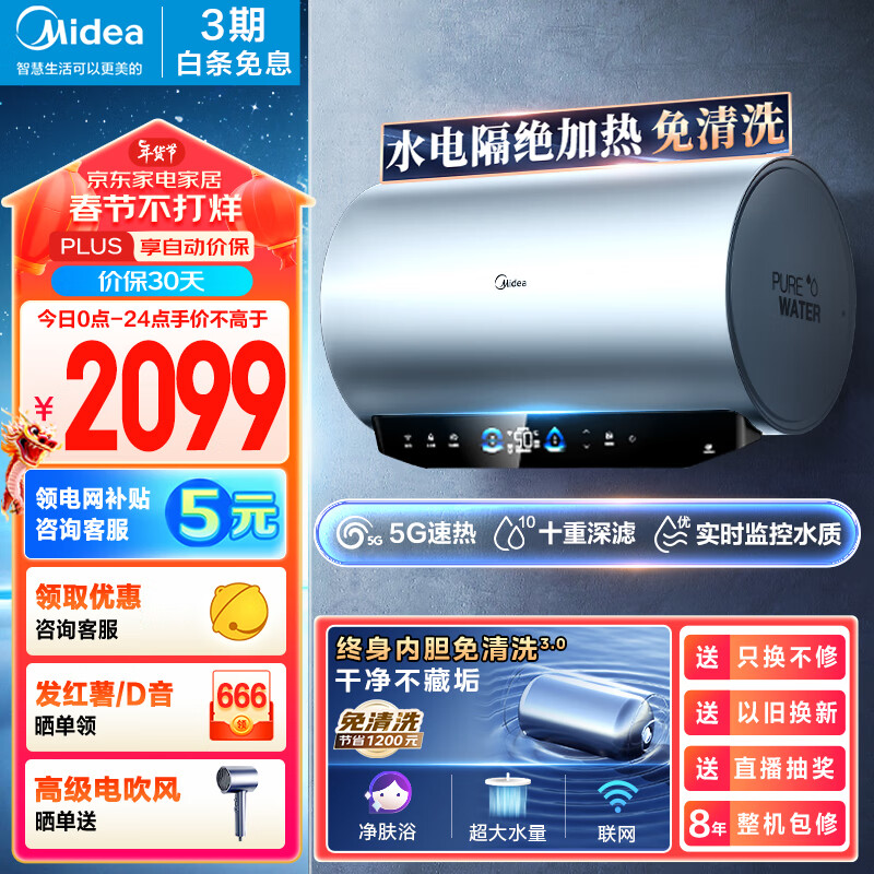 美的(Midea)水电分离80升电热水器家用 3300W变频5G速热 10重过滤净肤 瓷净舱内胆免清洗 储水式F8033-PE8(HE)价格:2299.00元!
