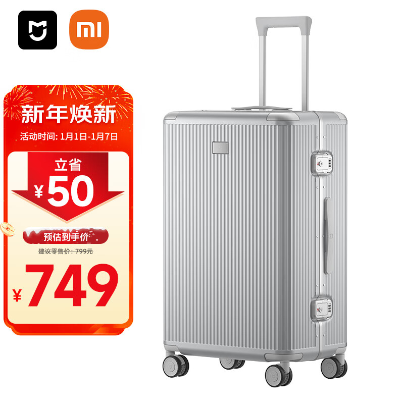 米家小米行李箱男铝框拉杆箱大容量旅行箱26英寸密码箱女银色价格:749.00元!