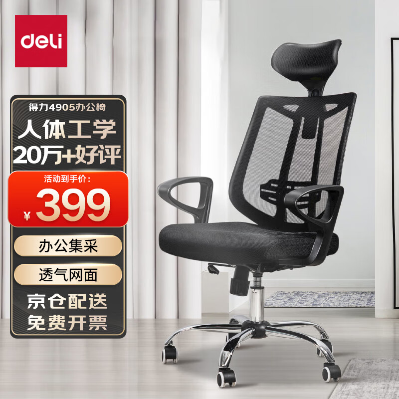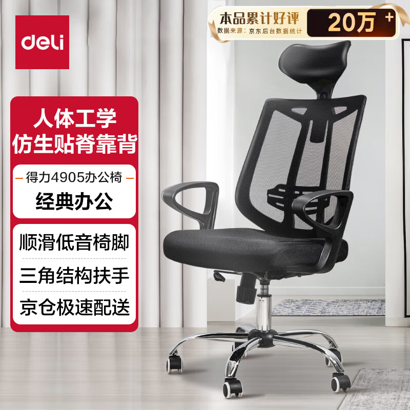 得力(deli)4905 人体工学电脑椅 头枕可调办公椅 仿生靠背125°后仰价格:449.00元!