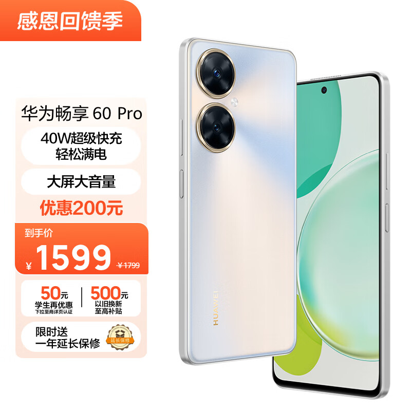 华为畅享 60 Pro 5000mAh长续航 40W快充 6.8英寸无界全视屏 双卡双待 256GB 星河银 鸿蒙智能手机价格:1549.00元!