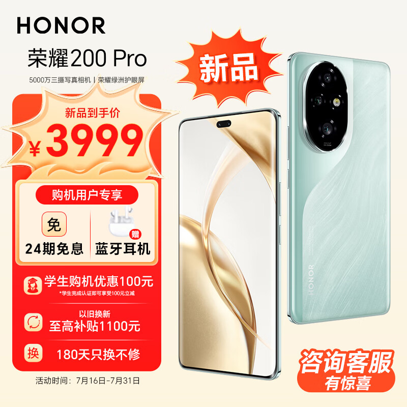 荣耀200 Pro 新品 旗舰级青海湖电池 绿洲护眼屏 雅顾光影主摄 第三代骁龙8s 16+512 天海青 5G AI手机价格:3999.00元!