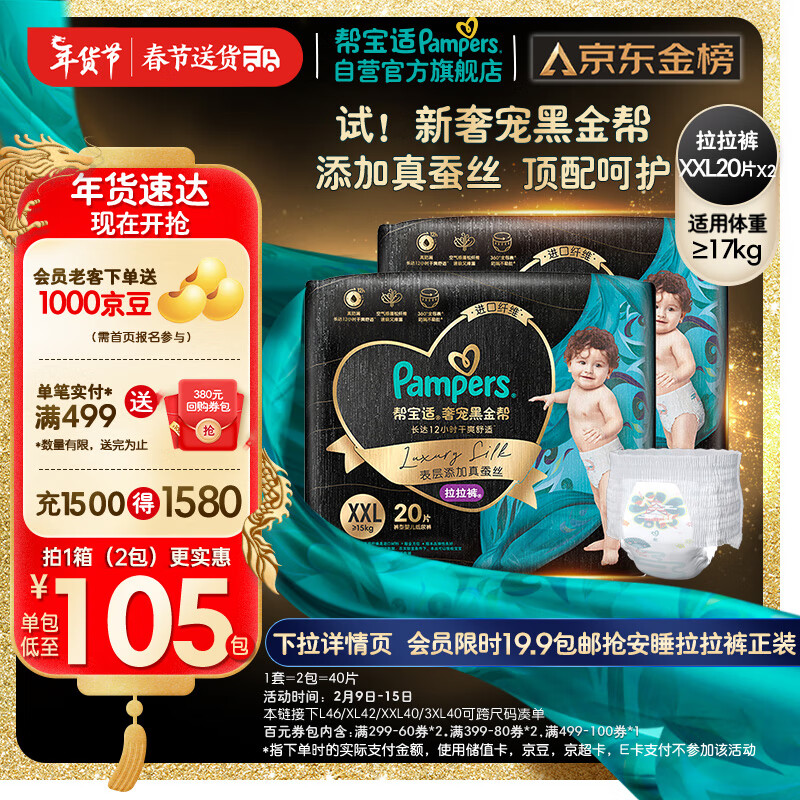 帮宝适黑金帮拉拉裤XXL40片(15kg以上)加大码尿裤尿不湿蚕丝 超薄透气价格:224.70元!