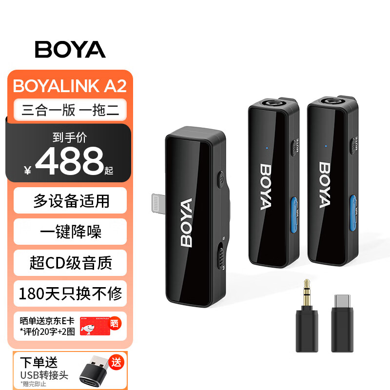 BOYA博雅BOYAlink无线领夹麦克风一拖二胸麦 手机直播带货单反相机短视频收录音降噪无线话筒多接口价格:575.00元!