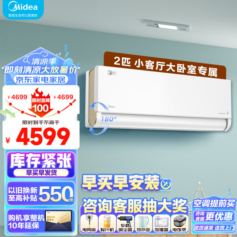 美的(Midea)空调 2匹旋耀 壁挂式 客厅商铺 冷暖挂机 京东小家智能生态空调 KFR-50GW/N8MXA3价格:4599.00元!