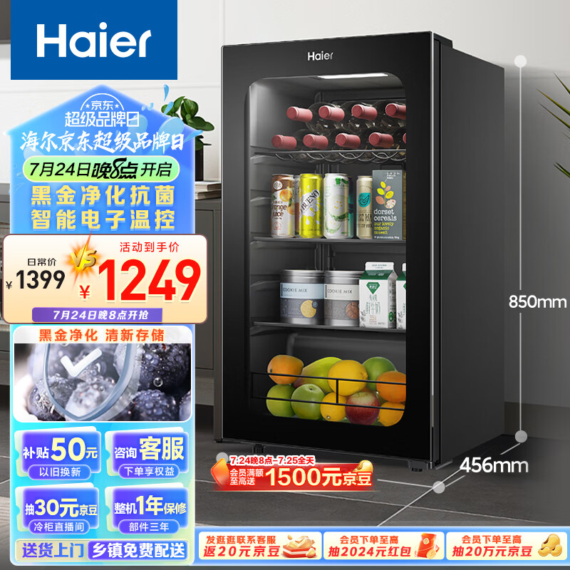 海尔(Haier)92升家用客厅办公室冷藏柜暖藏冰吧 茶叶饮料水果蔬菜保鲜柜囤货小型冰箱DS092LHESD1以旧换新价格:1249.00元!