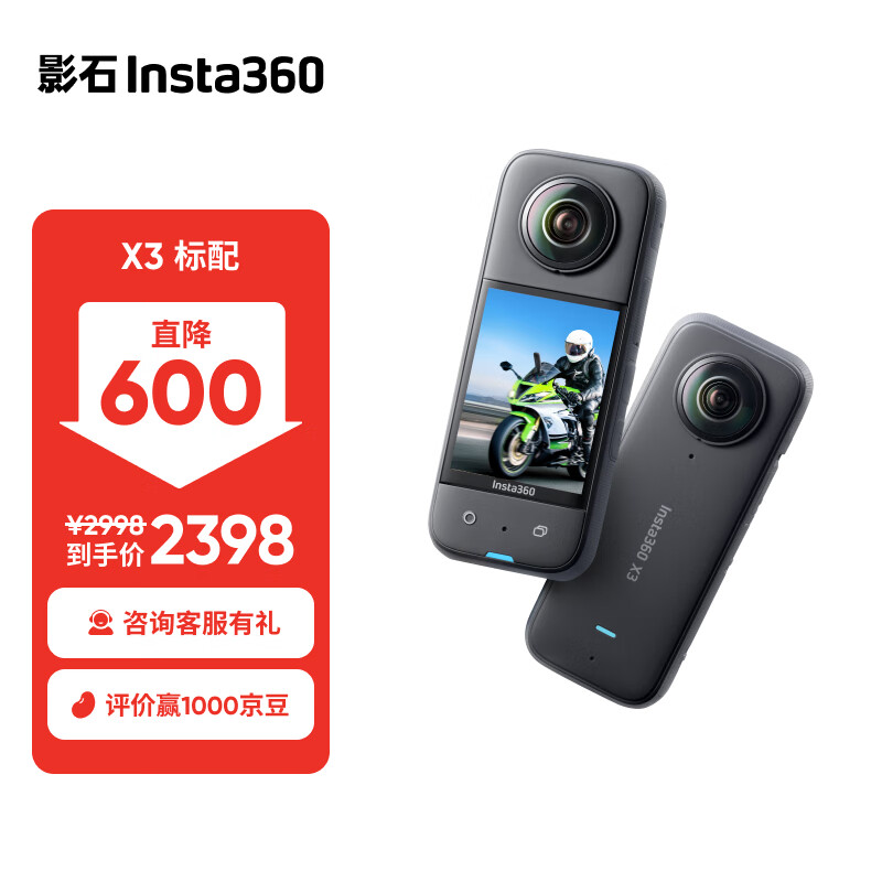 Insta360影石 X3全景运动相机防抖防水摄像机5.7K高清Vlog摩托车骑行滑雪潜水路亚价格:2398.00元!