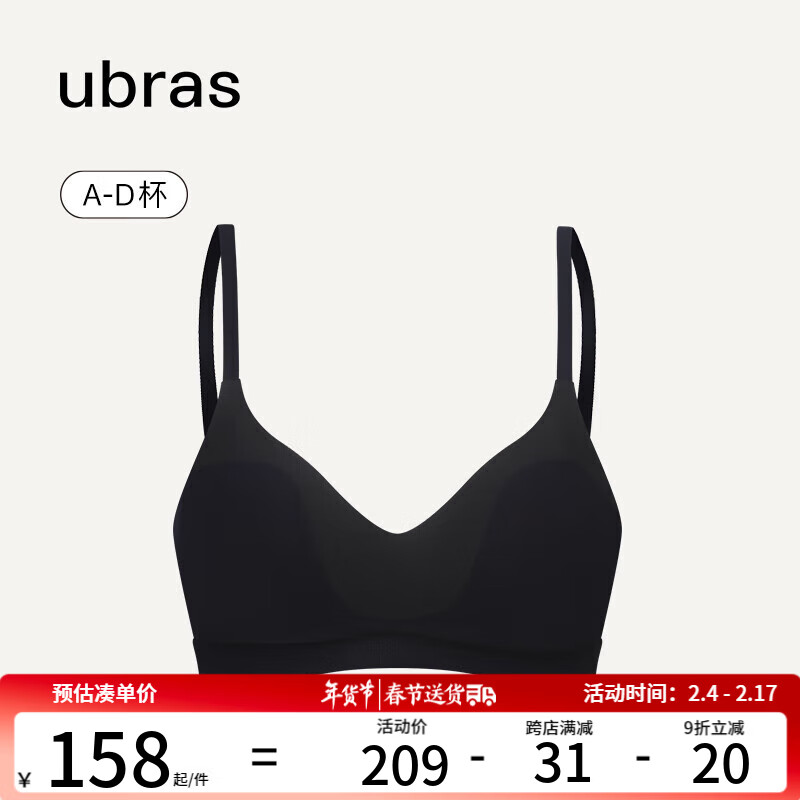 ubras极简V领光面兔耳杯背勾文胸女士内衣女大胸显小胸罩 黑色 L价格:209.00元!