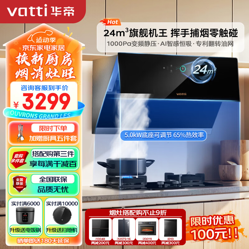 华帝(VATTI)抽油烟机家用顶侧双吸变频大吸力烟机燃气灶烟灶套装24风量自动洗侧吸灶具套装i11193天然气价格:3299.00元!