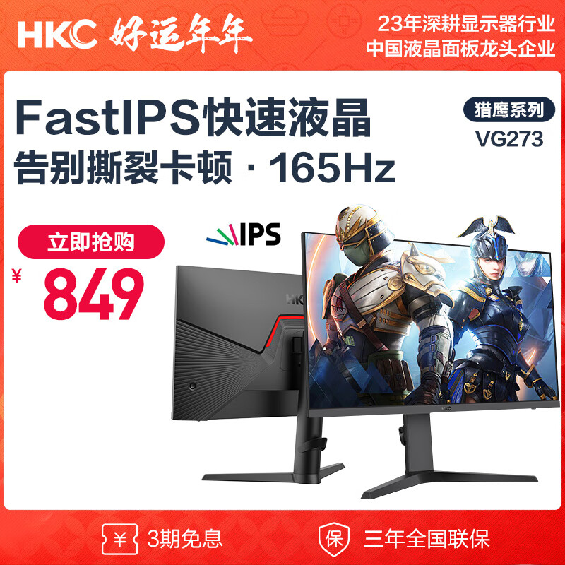 HKC 27英寸 FastIPS快速液晶 165Hz高刷GTG 1ms 电竞游戏屏 低蓝光不闪屏升降旋转显示器 VG273价格:999.00元!