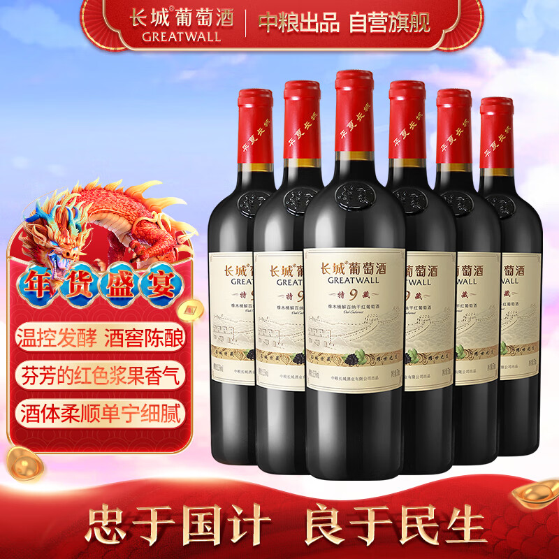 长城 特藏9 橡木桶解百纳干红葡萄酒 750ml*6瓶 整箱装价格:598.00元!