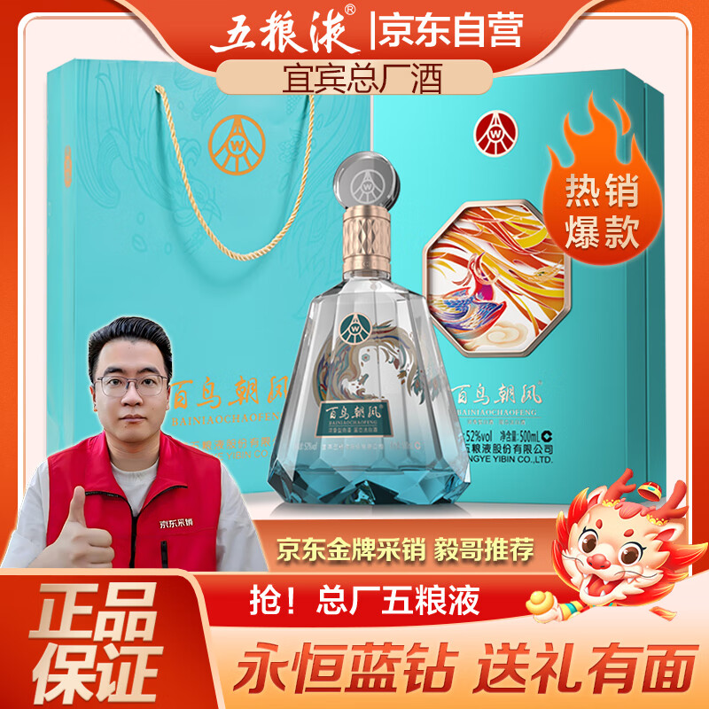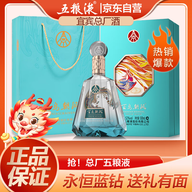 五粮液百鸟朝凤蓝钻浓香型白酒52度500ml礼盒送礼龙年节日高度纯粮酒水价格:290.00元!