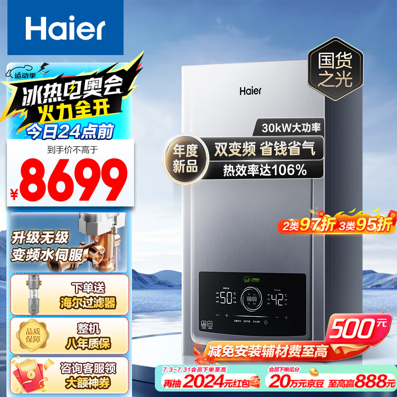 海尔(Haier)超一级能效冷凝无级变频水伺服燃气壁挂炉天然气双变频采暖炉热水器以旧换新LL1PBD30-JN7PRO价格:8699.00元!