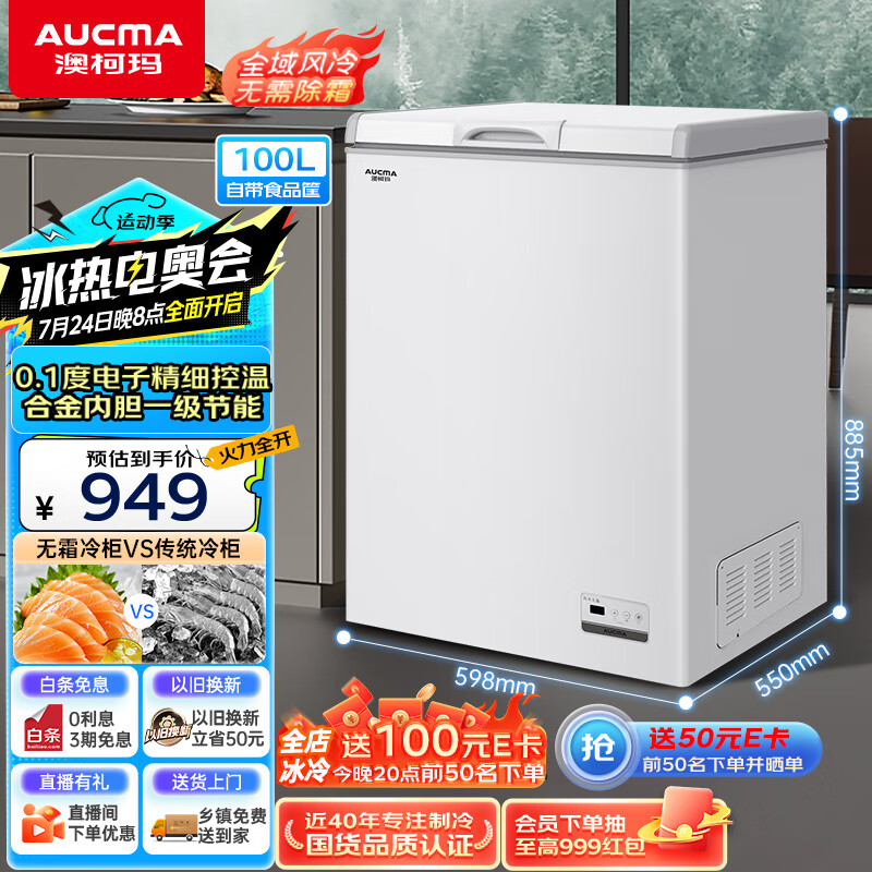 澳柯玛(AUCMA)100升风冷无霜冰柜家用商用单温冷藏柜冷冻柜母乳小冰柜商用小型冷柜冰箱BC/BD-100WHNE以旧换新价格:989.00元!